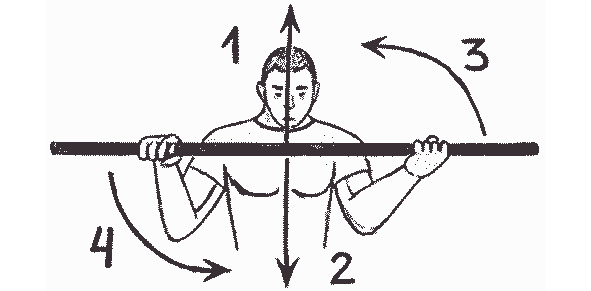 рисунок 11- Глухая защита шестом: Выставив шест перед собой в горизонтальном положении, блокируем удары вражеских рук на высоком уровне и/или удары ногой на низком уровне, перемещая шест вверх (1) и вниз (2). Путем поворачивания шеста блокируем боковые атаки справа и слева (3,4).