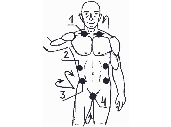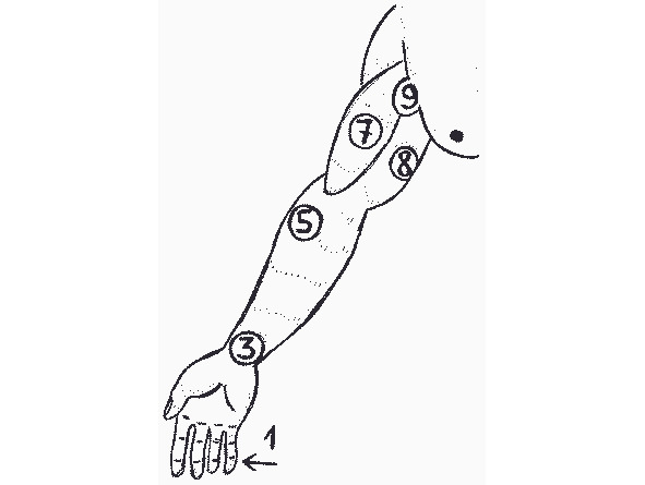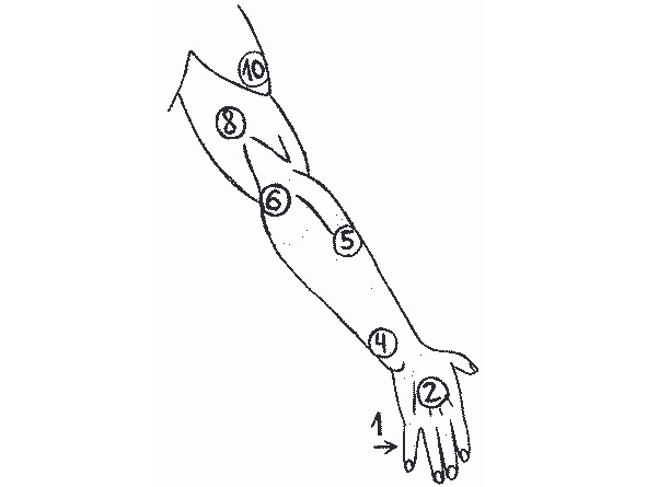 рисунок 7- Уязвимые точки руки: 1- суставы пальцев; 2- нервные окончания кисти; 3- внутренняя сторона запястья (медиальный нерв); 4- локтевая кость (3 см выше запястья); 5- лучевой нерв (внутри бугорка на предплечье); 6- локтевой нерв (внутренний мыщелок плечевой кости); 7- место крепления бицепса; 8- трицепс; 9- подмышечный нервный узел; 10- лучевой нерв (под местом крепления дельтовидной мышцы).