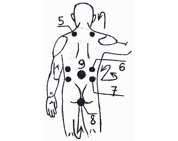 рисунок 10 б- Смертельно опасный удар промеж лопаток (по 5—6-му грудным позвонкам).