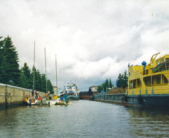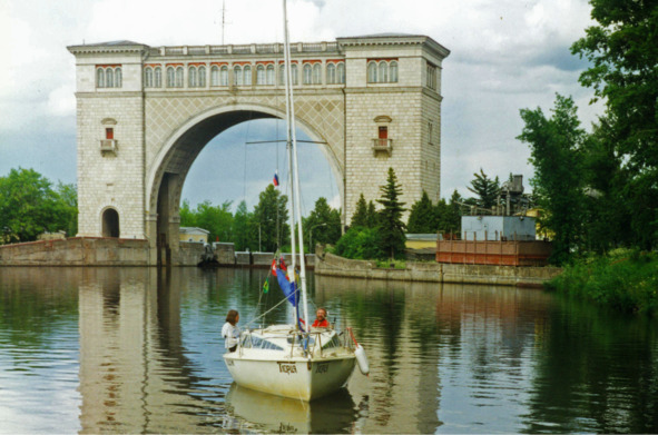 Отвальной решили в яхт-клубе не делать и ушли к вечеру по-тихому, чтобы засветло дойти до первого шлюза (№6) в Канале им. Москвы и там заночевать до утра. Идти надо было под моторами часа три-четыре. Подвесные моторы довольно шумная штука. Идти до Онеги нам предстояло, в основном, по фарватерам, а значит на моторах, и надо было привыкать. Переночевали у берега, уткнувшись носом в траву. Рано утром, только рассвело, побежали на Шлюз к диспетчеру показывать документы – тогда были такие правила, и капитаны маломерных судов должны были предстать с документами перед очи диспетчера шлюза. Нас записали в очередь. И мы стали ждать, когда последнее заходящее судно в шлюз позовет и нас криком матроса с борта: «Эй, на яхтах, заходите после нас!» Но мы, имея радиостанции речного диапазона, что тогда было большой редкостью, и сами слышали, что говорит диспетчер шлюза.