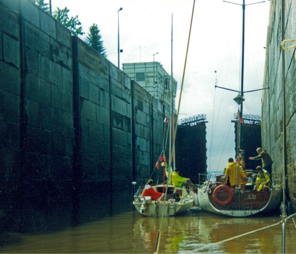 И тут случилась неприятность с мотором – на малых оборотах он исправно крутил винт, а чуть прибавишь обороты/газку, и винт вращаться переставал. Разбираться было некогда, нас приглашали в Шлюз. Вот сейчас вы не поверите, но помогать заходить в шлюз и выходить мне помогала яхта и её команда – именно тот «ТАУРУС» (и именно тот Капитан), на который я подвозил своего сокурсника из МИФИ – помните? Они взяли нас «под борт» и завели в шлюз. И тут получилась хохма. Когда нас брали «под борт», от нас требовалось передать на «ТАУРУС» наши кормовой и носовой концы. Я был на корме и кинул нашу обычную шлюзовую чалку, а Кок растерялся, или перепутал в спешке – все ж надо мгновенно делать, и кинул якорный конец вместе с… якорем! Это был финиш, кто-то из команды Тауруса, кто больше до этого выпил, ржал, чуть не выпадая за борт, а кто-то, кто меньше выпил, включая Капитана, ругались матом, да так смачно, что в шлюзе примолкли лягушки и сам диспетчер. А дело было в том, что якорь упал на ТИКОВУЮ палубу – ну, кто в теме, тот поймет.