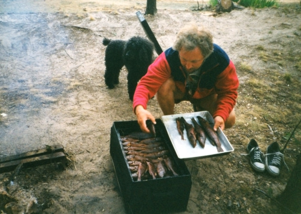 Дело ведь нехитрое. Главное – это коптильня, плотно закрывающийся металлический чемодан с решетками внутри. Лучше, если коптильня сделана из нержавейки, а решетки из титана. Под решетки на дно ящика кладут веточки ольхи или ивняка (возможны и другие варианты) слоем пять-десять сантиметров, поплотнее. Вставляют решетки с выложенной на них рыбой на спинки, чтобы сок не вытекал, закрывают крышку на защелки и ставят чемодан на костер, используя подставки. Лучше, если костер уже прогорел и в нем угли. Минут через десять-пятнадцать из-под крышки начинает струиться дымок. Уже минут через тридцать от запаха дымка начинает течь слюна. Обычно к этому времени рыба и готова. Сняв чемодан с огня, торопиться открывать крышку нельзя, надо дать остыть, а то полыхнут обугленные ветки, что на дне. А солить для копчения рыбу надо так: чистим от внутренностей, обсыпаем солью, укладываем в полиэтиленовый пакет и плотно заворачиваем (да не в один, а в 3—4 пакета) и закапываем в песок на глубину 35—45 см – под гнет, чтобы рыба просолилась, но лишней соли не взяла. Через 2—4 часа, в зависимости от размера, выкапываем, промываем в воде, подсушиваем на солнце и ветерке и начинаем коптить.