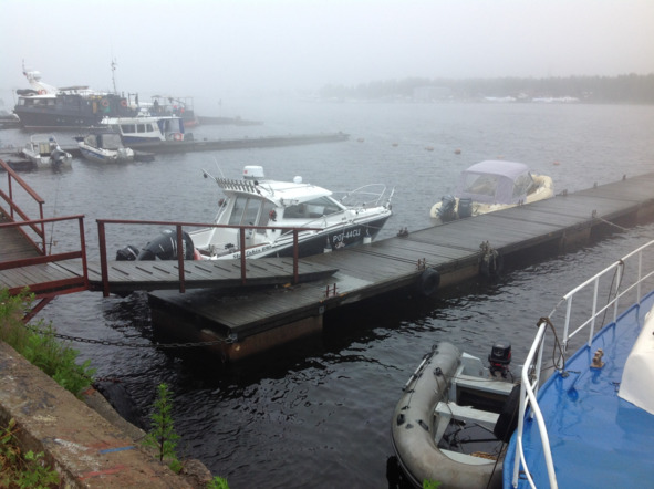 Но в яхт-клубе тихо, ни души, клуб заполняется клочьями тумана, который втискивается через устье Вуоксы. Не видно противоположного берега, тишина, даже нет собак, что обычно встречают всех лаем. Моросит мелкий дождь, а туман добавляет влажности. Тихо разговаривая между собой, мы замечаем пар изо рта, а это означает, что температура +10—120С и не больше. У причалов нет лодок.