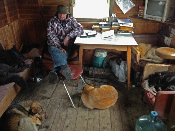 Юрий Владимирович и собаки сидят в сторожке у печки