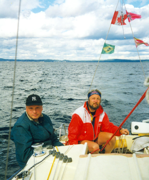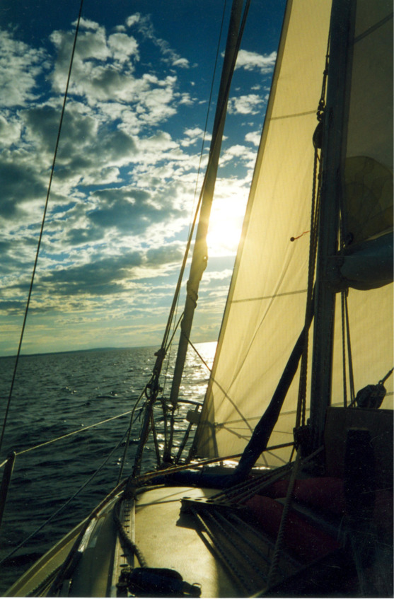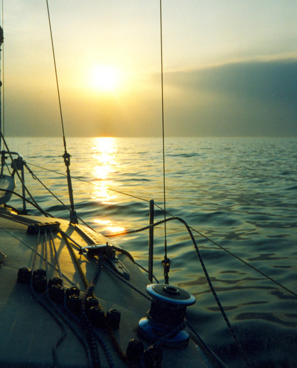 Как только мы вышли из-за острова на открытую воду, ветер наполнил паруса, сильно накренив яхту, понес в направлении первой точки поворота на маршруте, до которой, как показывал GPS, было 30 миль. Мои матросы перебрались на наветренный борт, улучшив ситуацию с креном. Шли мы левым галсом в бейдевинд со скоростью 5—6 узлов. Ветер дул ровный 11м/с, а волна была где-то 1—1,2 метра. Сначала было неуютно, нервно, напряженно, но постепенно мы стали привыкать и к крену, и к ветру, и к волне, и к брызгам, начали улыбаться, переговариваться, шутить – отлегло. Я впервые ощутил, увидел и осознал то великолепие, которое нас окружало: солнце и бурную воду всю в серебре от солнца, шум ветра и волн, журчание воды за кормой – этот восторг пришёл ко мне впервые, на парусных досках было немного по-другому, хоть и скорость много выше. Уже через полчаса мы отдали рифы на гроте. Скорость достигла семи с небольшим узлов – мы летели, крен яхты увеличился, и нам всем, включая пса Эдди, пришлось сесть на один борт и упираться ногами в банку другого борта – при этом вода шла по палубе и внешней части спинки кормовой банки. Удивительно, но наш пёс ориентировался в происходящем быстрее матросов и сам, без команд перепрыгивал и занимал именно то место, где он не будет мешать и где надежнее. Я совершенно тогда не думал, что собаке нужен спас жилет – такие вот мы рисковые были с ним ребята.