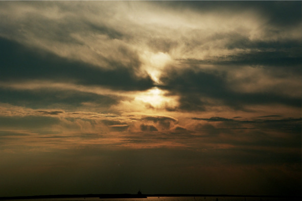 Мы стояли в Новосельском заливе, на Иваньковском водохранилище. Дело было под ночь, начиналась гроза, накрапывал дождь. Я лежал в носовой каюте и читал книгу. Вокруг громыхало. Чувствовалось, что гроза приближается – всё меньше времени проходило от вспышки молнии до звука грома. В какой-то момент одновременно сверкнуло и громыхнуло так, что я сразу оглох и перестал различать звуки, а вокруг стало светло, как бывает в зале, где включены софиты. Причём свет сначала включали, как бы поворачивая реостат, а потом он начал спадать, яхту тряхануло.