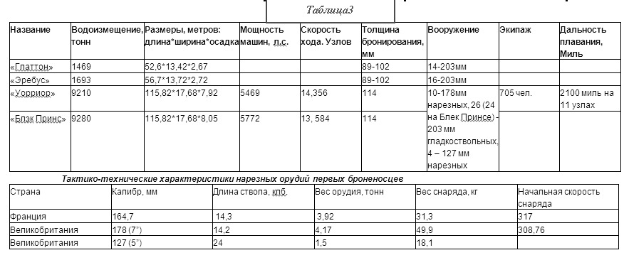 Тактико-технические характеристики ранних английских и французских броненосцев