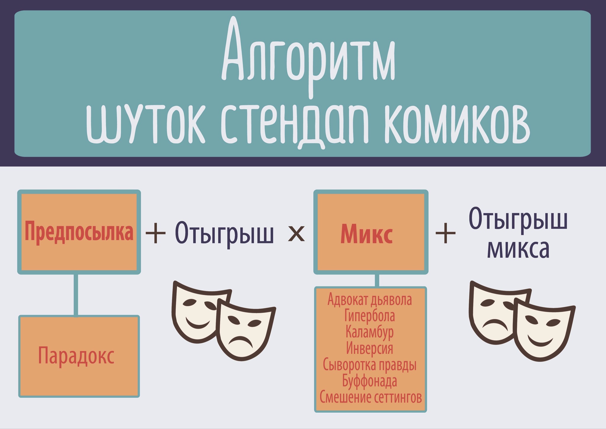 Хорошо в этом плане помогает и насмотренность. Если вы смотрите большое количество комедийных шоу, много и легко смеётесь, то следующим шагом для вас будет умение разложить шутки, которые вы слышите на парадоксы, и заложенные в них противопоставления (глава «Парадоксы»).