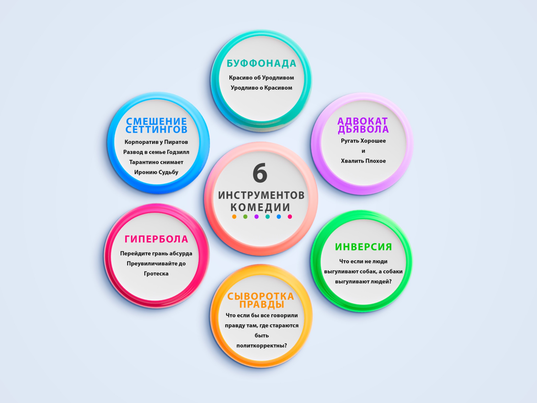 Я записывал эти видео по принципу доступности для самых неподготовленных учеников. По большому счету, это теория + упражнения на написание, редактирование материала, креативность и настройку чувств на умение определять суть шутки.