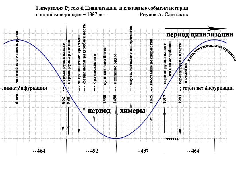 Схема Гиперволна Духа Русской Цивилизации. Пояснение к графику. Здесь я изобразил ключевые, на мой взгляд, события русской истории в связи с открытием НЕВИДИМОЙ ГИПЕРВОЛНЫ, гиперколебания Духа Русской Цивилизации. Объяснение этой концепции будет изложено в самой книге. Здесь и далее под фразой Русская Цивилизация (РЦ) подразумевается внутренняя сила русского народа, которая раскрывается при определённых благоприятных обстоятельствах. Это уникальный глубинный характер, основы которого одинаковы у всех причастных к этносу русский. Это то, что их отличает от других. Это код, рождённый именно здесь и именно у этих людей. Рисунок автора.