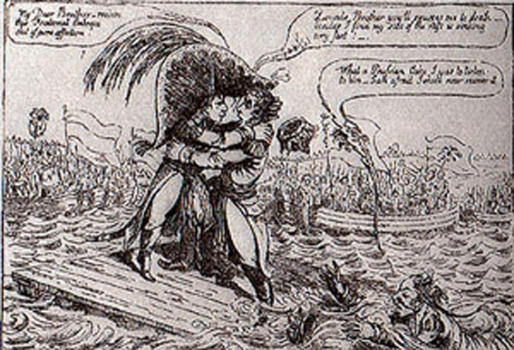 https://ru.wikipedia.org/wiki/Тильзитский_мир#/media/File:Tilzit03l.jpg Императорские объятия на плоту. (Встреча в Тильзите). Английская карикатура неизв. худ. 1800-е гг. неизвестен – http://www.museum.ru/1812/Library/Davidov6/index.html.