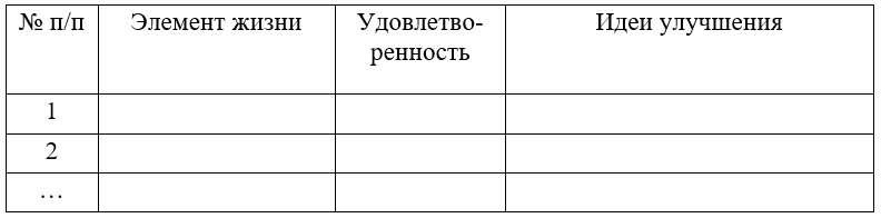 Удалите все столбцы, кроме первого – «Элемент жизни». Добавьте два новых столбика: «Удовлетворенность» и «Идеи улучшения». Получится вот что.