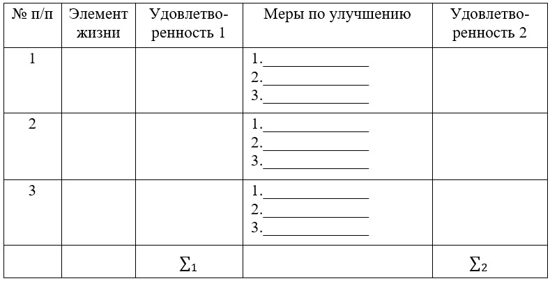 В графу «Элемент жизни» запишите 3 элемента, которые вы выбрали для проработки. В графу «Удовлетворенность 1» перепишите оценки из прошлой таблицы. В графе «Меры по улучшению» запишите для каждого элемента жизни 3–5 конкретных действий, которые вы совершите в ближайшую неделю для его улучшения.