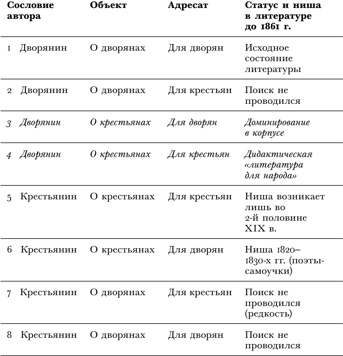 Резюмируя этот краткий социологический экскурс, можно свести в таблицу все возможные комбинации авторства и адресации текстов, созданных дворянами и крестьянами (см. табл. 1).