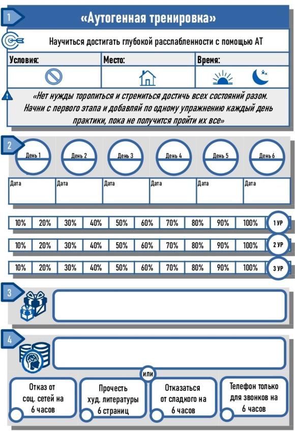 РезюмеЭто первый шаг на пути личного роста к достижению осознанности! По завершении может сложиться впечатление, что АТ слишком трудоёмкая и отнимает много времени, но уверяю: с опытом и регулярностью выполнения на практику будет уходить по 10—15 минут. Этого времени будет достаточно, чтобы достичь нужной продуктивности. Если пожелаешь уделять больше времени на практику, то твоя награда будет в виде большей пользы.