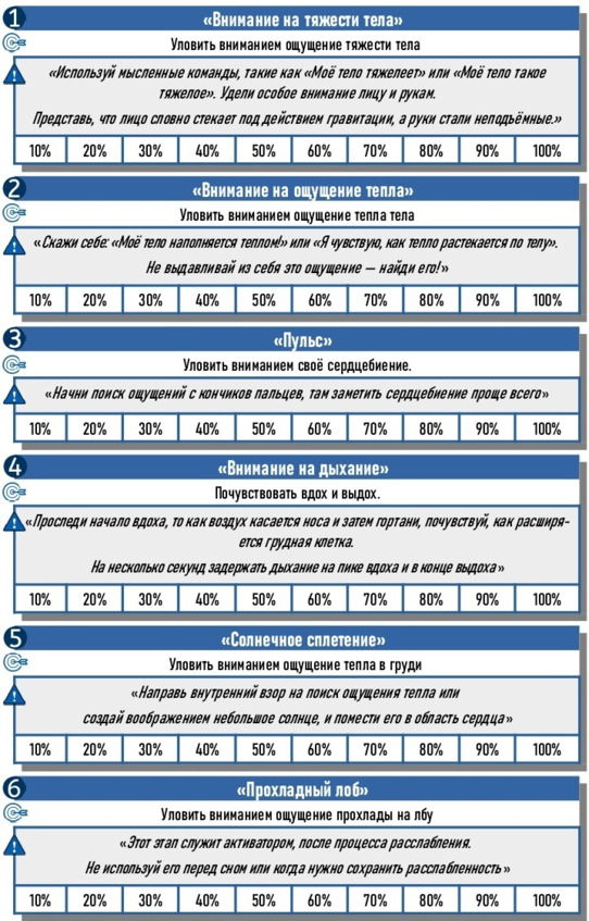 Ниже приведены шесть этапов основной ступени аутогенной тренировки с кратким описанием действий для каждого шага. Это руководство можно использовать как памятку во время практики.