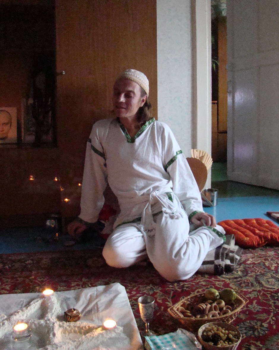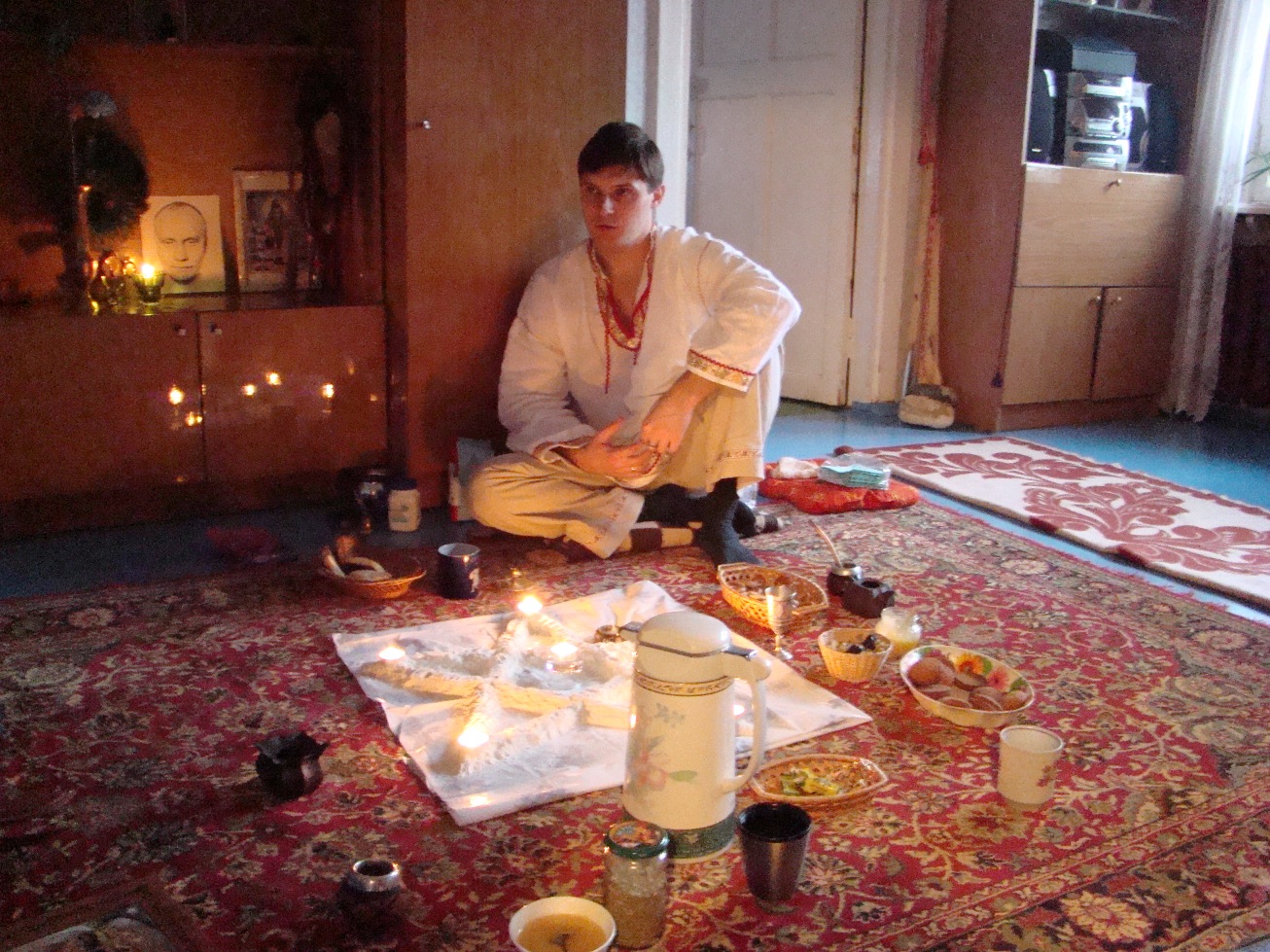 С Виталием я встретился ранней осенью 2008 года на встрече-медитации у Вовы. Мы с Вовой организовали у него дома встречу нашего жреческого коллектива и других активистов с человеком, которого мы позиционировали в нашей среде как специалиста, первоисточник всех наших дел по русской традиции и вообще как русского волхва. Собралось тогда около 10 человек, многие из первоначально желающих в итоге до встречи так и не доехали. Для меня это была знаковая встреча, хотя внешне ничего необычного не происходило, разве что запомнилась выложенная в центре комнаты на клеенке из муки красивая, объемная, белая, четырехлучевая свастика, на лучах которой были установлены свечи. Была короткая групповая медитация, в конце которой мы несколько раз пропели "Ом", теплое душевное общение, чай с разными плюшками. Не могу сказать, что я был потрясен Виталей, внутри у меня все перевернулось, я пережил какие-то прозрения и откровения. Нет, никаких спецэффектов не было, он был небольшого роста, выглядел и говорил просто, четко, весомо, собрано, по делу, ни о чем не проповедовал, не вещал. Но он был во всем на 100%, в каждом своем действии, в каждом взгляде, жесте, движении, я ощущал в нем реальную всеполноту бытия, проявленную и реализованную человеком. И напрямую взаимодействуя с ним, смотря на него, спрашивая, отвечая на его вопросы, я внутренне переживал свое личное соприкосновение через него с этой безличной всеполнотой. И в этом просто было для меня всё.