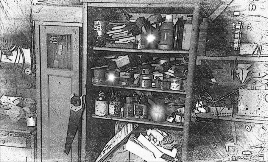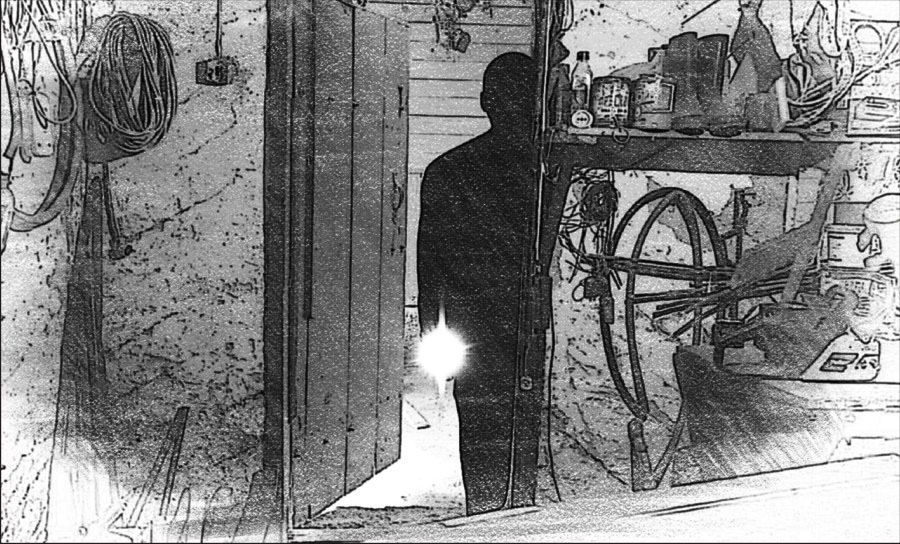 «Трах-бах!» – влетела гайка. Вошедшая тень схватила с ближайшей полки сияние и – бегом к выходу, попутно соскребая собой всю паутину со стены. Захлопнула дверь гаража, и след её простыл.