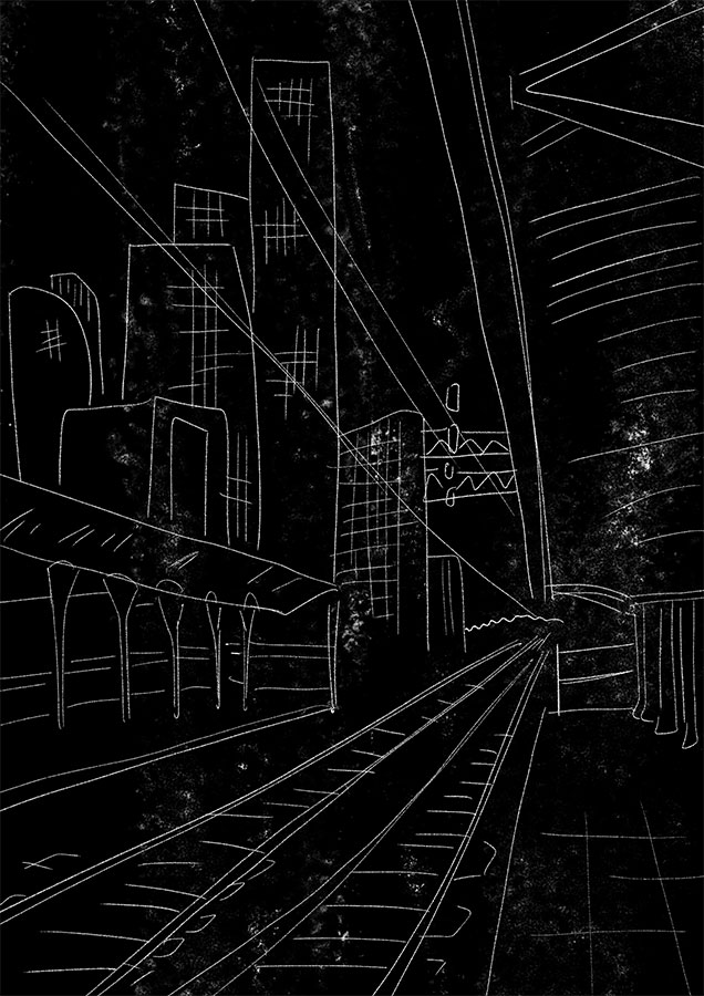 Здесь здания так высокоВзмывают ввысь, что режут глаз.Стекло и металлический каркасРасположились возле станции метро…Смотрю и вижу остров я:Там небывалой мощи корабли,Изломанные линии стеклянных стен,А рядом новый метрополитен…