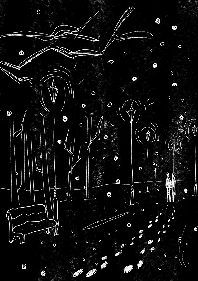 Вечер погас. СлышуШум шоссе вдалеке.Снег выпал. Тише.Открой глаза. Живи…Шёл в никуда. Ночью.Горят кругом фонари.Снег выпал. Тише.Открой глаза. Жди…Я не ставлю точек:Это ещё не конец строки.Снег выпал. Тише.Открой глаза. Живи…Конец прекрасной эпохи