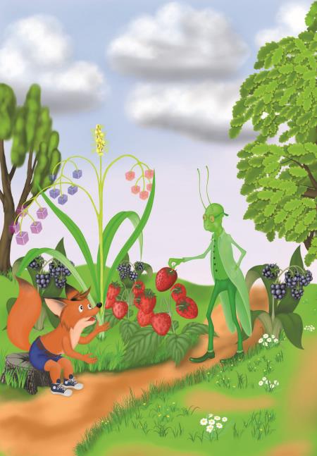 «Конечно, бегать, прыгать и играть – это интересно! Но причинять вред кому-то, а особенно такой красивой ягоде и такому симпатичному кузнечику, как этот, я не хочу! Пойду-ка я дальше, поищу, чем ещё может такой лисёнок, как я, заняться».