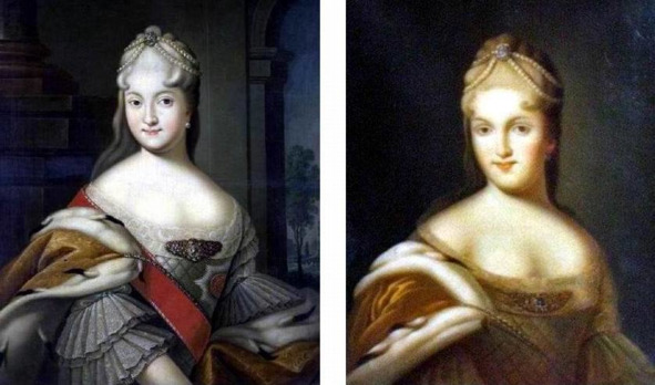 Отметим, что портреты, приписываемые Екатерине II, также изображают ее как с ярко-голубыми глазами, так и ярко-карими, что невозможно.