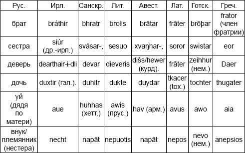По мере развития индоевропеистики быстро удалось выяснить, что родство отдельных наречий было наибольшим в самых древних областях этих языков. Например, в системе родства обнаруживалось поразительное сходство не только в главных понятиях «мать» и «отец» (названия которых звучат в силу ряда причин близко не только в и.-е. языках), но и в более второстепенных (см. табл.)