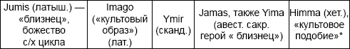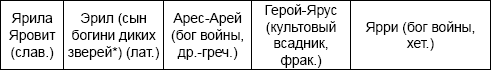 Мало того. Ученые, на основании анализа многочисленных памятников архаического искусства и мифологических текстов предположили существование изначальных, общих для всех и.-е. народов типов богов, как (по А.Н.Фанталову): «Бог Грома» (индийский Индра, скандинавский Тор, кельтский Таранис, славянский Перун, балтский Перкунас); «Бог Ясного Неба» (греческий Зевс, скандинавский Тор, индийский Дьяус, балтский Диевас, славянский Дий); «Великая Богиня» (греческая Гера, индийская Приттхиви, скандинавская Ерд, славянская Макошь, балтская Земес Мате, ирландская Дану); «Божественные Близнецы» (греческие Диоскуры, индийские Ашвины, балтские сыновья Диеваса); «Бог Земных Сил» (греческий Дионис, индийский Рудра, скандинавский Фрейр, славянский Велес, балтский Веле, кельтский Цернунн); «Культурный Герой» (греческие Гермес и Геракл, скандинавский Один, славянский Геровит, ирландский Луг).