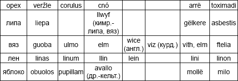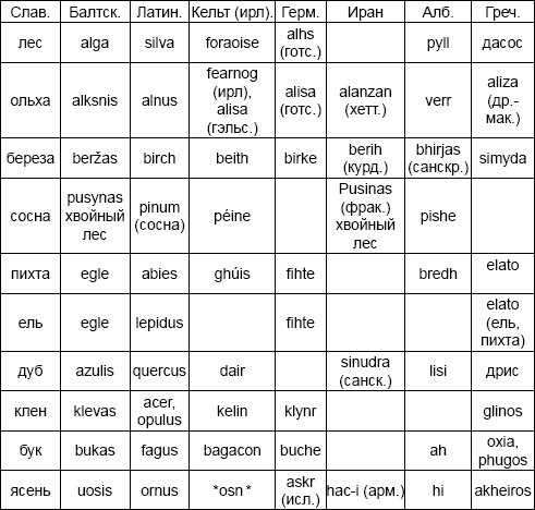 В любом случае мы видим в и.-е. языках довольно большое многообразие «пересекающихся» названий деревьев, что означает, по крайней мере, одно: ПИЕ прародина лежала в лесной зоне. Косвенно это подтверждают и другие свидетельства: «Индоевропейские названия трав (белена, чемерица, марь, дягиль, сныть, папоротник скорее указывают на лес, чем на степь» (В.А. Дыбо). Судя по количеству этих пересечений, это был лес умеренной лесной зоны.