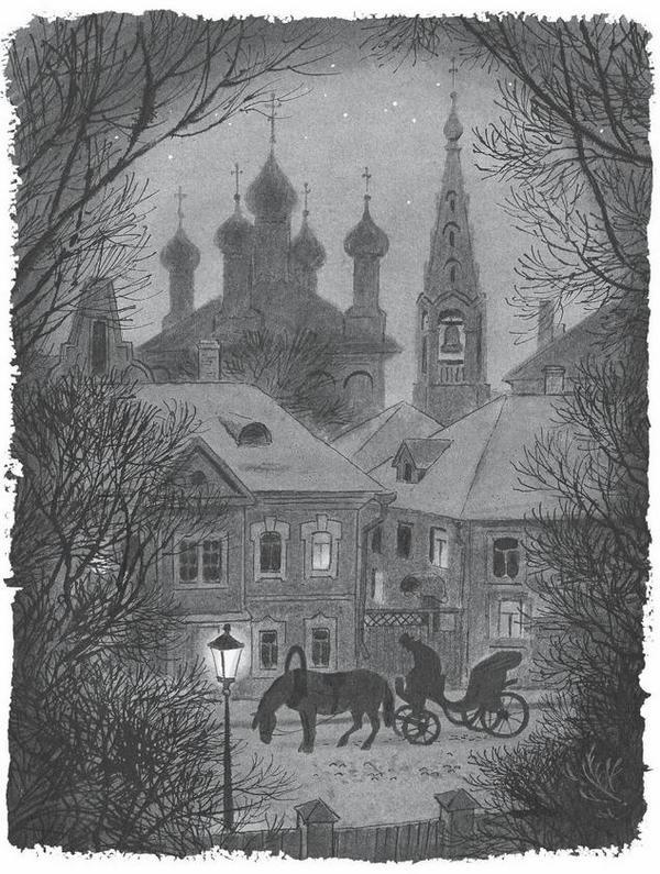Через дверь, открытую в мутную предутренней мглой комнату, видно, как под тихие, осторожные шорохи движется неясная фигура. Она то зыбко выделяется густым серым пятном, то снова расплывается и совсем сливается с мутной мглой. Шорохи стихают, скрипнула половица, и ещё одна – подальше. Всё стихло. Это няня ушла в церковь, к утрене.