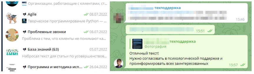 Очень часто в «телеге», можно заметить, как сотрудники технической поддержки, привлекая внимание аналитиков, разработчиков, общаются по вопросам клиента и все вместе решают проблему клиента – это очень важно, чтобы сделать лучшую техническую поддержку.