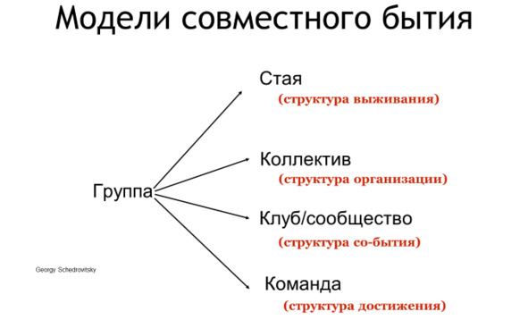 Вот на этом простом примере можно увидеть разные виды этих групп: коллектив, сообщества, команды. Дальше я концентрируюсь на сообществе и буду преимущественно обсуждать вопросы сообществ.