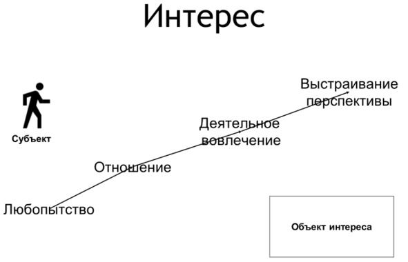 Поговорим про интерес или про стадии вовлечения в сообщество. Интерес складывается из двух составных частей: первая – тот, кому интересно (человечек на слайде, субъект), а вторая – объект интереса, про что сообщество. Если это хобби, то тема нашей коллекции, наше интересное занятие. Если это сообщество практики, то это развитие нашей профессии.