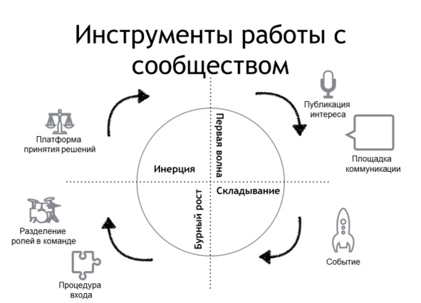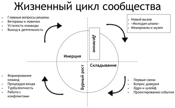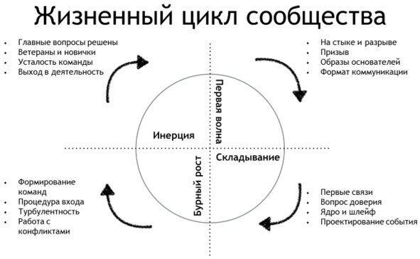 И инерция, когда наплыв людей схлынул, кто-то остался, кто-то ушел, кто-то принял нормы и обычаи сообщества, которые уже сложились довольно прочно. И после этого есть два варианта. Первый либо в состоянии инерции, так и будем продолжать жить. В этом нет ничего плохого. Просто когда идет складывание и бурный рост, это означает, что сообщество какой-то важный нерв зацепило, какую-то проблему сковырнуло. А инерция означает, что проблема либо решена, либо стало понятно, что это сообщество не имеет амбиции её решить. Просто что-то хорошее делает – и ладно.