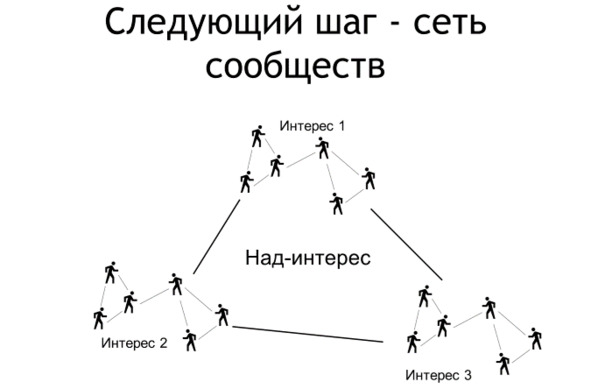 Последнее, что важно сказать. После сообщества следующий шаг – это сеть сообществ (Рисунок 15). Они базируются на над-интересе. И каждое сообщество не теряет собственной идентичности, собственного культурного кода, сможет найти точки соприкосновения с другими сообществами. Чего я вам и желаю.