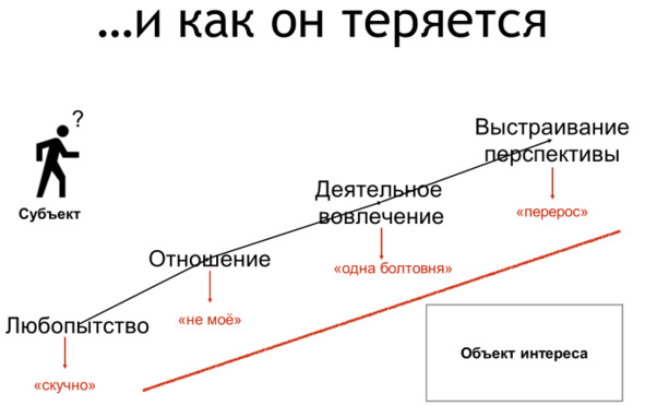 • На стадии любопытство барьер звучит как «скучно». Я пошел, послушал, но не смогли меня ребята зацепить, захватить мое внимание, действительно показать объект своего интереса, свое сообщество. Я не увидел там чего-то такого. Я не увидел огонька в глазах, что они сами в это не верят. Я не понял их сообщества – оно какое-то слишком сложное, мудреное. Я посмотрел, пойду дальше куда-нибудь.