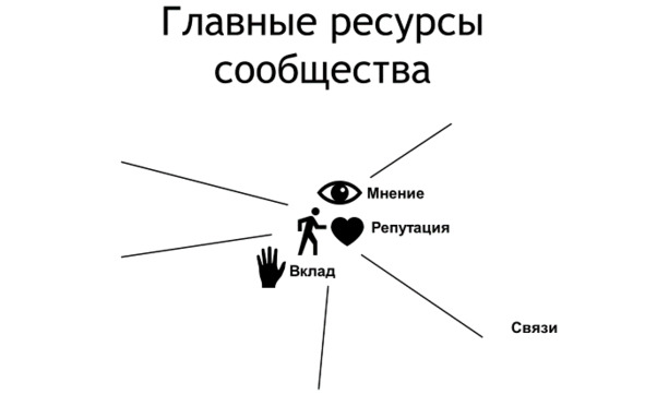 Есть такое заблуждение, с которым я часто сталкиваюсь, особенно в некоммерческой сфере, что единственный вообще ресурс – это деньги или что ресурсов всего два – деньги и время. Всё остальное как бы и не существенное, такая пыль под ногами. Я с этим категорически не согласен, и мы с коллегами считаем, что главными ресурсами сообщества являются то, что в него, строго говоря, привносят люди.