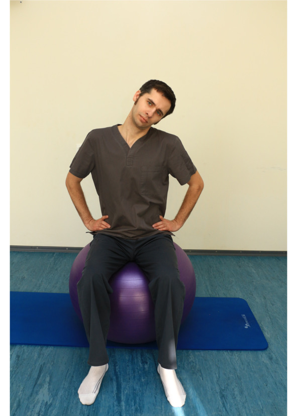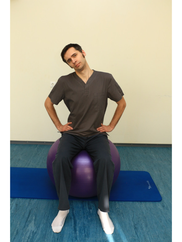 Рис. 9. Упражнение лечебной физкультуры, используется фитбол: исходное положение «сидя на фитболе», руки на поясе, производится плавный наклон головы вправо на выдохе.