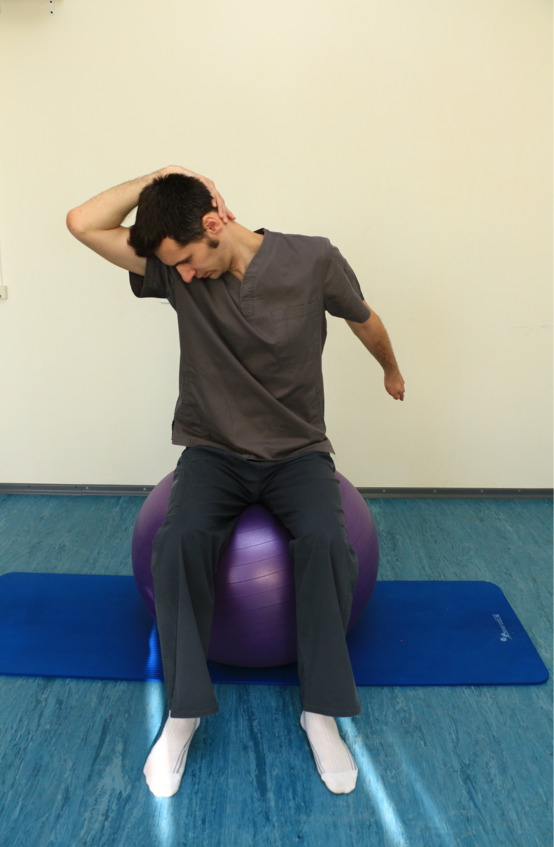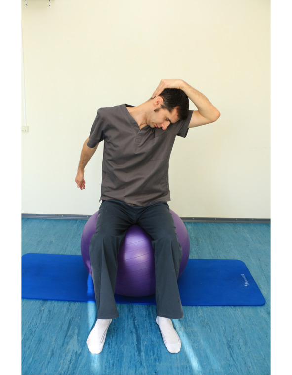 Рис. 12. Упражнение лечебной физкультуры, используется фитбол: исходное положение «сидя на фитболе», наклонить голову вперед и в сторону влево. Руку со стороны наклона опустить на затылок, создавая легкое отягощение и растягивая мышцы на выдохе.
