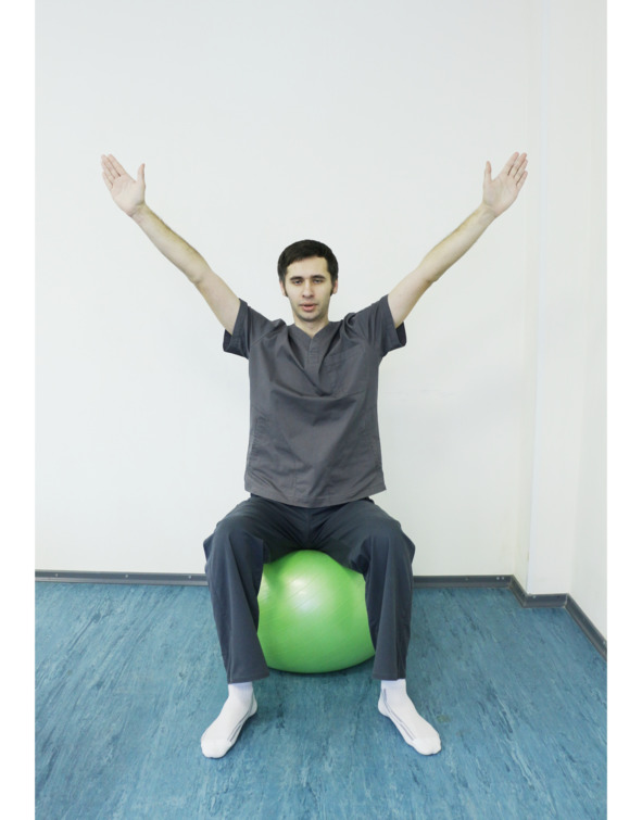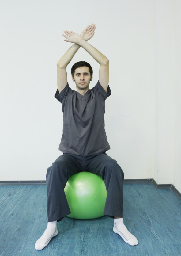 Рис. 13. Упражнение лечебной физкультуры, используется фитбол: фаза 1. Исходное положение «сидя» на фитболе, руки подняты вверх, слегка согнуты в локтях и перекрещены, ноги согнуты в коленных суставах, стопы слегка развернуты кнаружи.