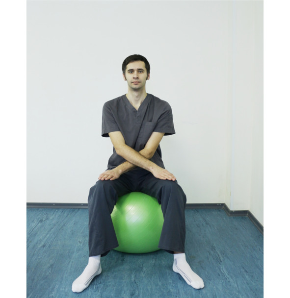 Рис. 4. Упражнение лечебной физкультуры, используется фитбол: используем статичное положение «сидя» на фитболе, руки сложены в локтях и перекрещены, кисти расположены на бедрах, ноги согнуты в коленных суставах, стопы слегка развернуты кнаружи.