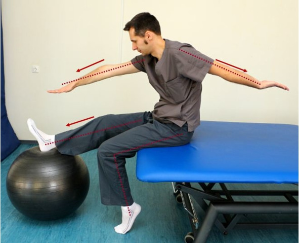 Рис. 5. Упражнение лечебной физкультуры, используется стол для Войта-Бобат терапии, фитбол: исходное положение «сидя», правая нога выпрямлена с опорой на фитбол, левая нога согнута в коленном суставе с опорой о пол, правая рука выпрямлена вперед, левая рука выпрямлена назад, корпус слегка наклоняем вперед, задерживая положение на 10—15 сек, повторяем для правой и левой ноги поочередно 5—10 раз.