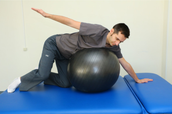 Рис. 6. Упражнение лечебной физкультуры, используется стол для Войта-Бобат терапии, фитбол: фаза 1 – Исходное положение «на четвереньках» с опорой на левую руку, колени, корпус опирается на фитбол, правая рука выпрямлена и отведена назад,
