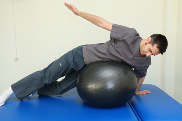 В положениях «лежа спина (живот или боком) на фитболе» (рис. 6, 7) упражнения, считаются одними из самых сложных, так как в их выполнение вовлечено большое количество мышечных групп, а опора наиболее нестабильна. Начальные положения в фитбол-гимнастике можно комбинировать с различными двигательными элементами и паттернами движений. Например, в положении «сидя на фитболе» можно имитировать ходьбу и бег на месте, из положения «сидя на фитболе» можно переходить в стойку. Это упражнение особенно применимо в адаптивной физической реабилитации для больных и инвалидов с поражением опорно-двигательного аппарата.