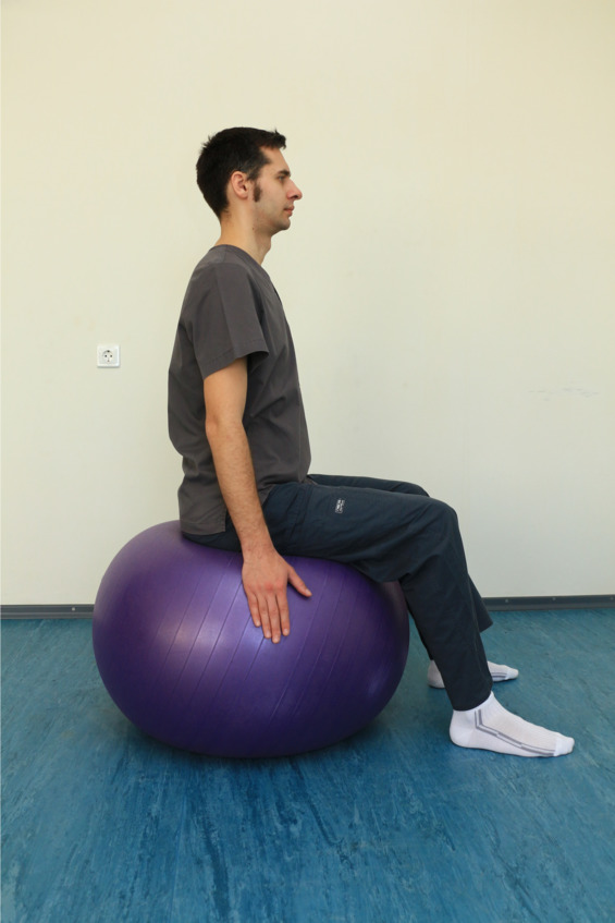 Упражнения, выполняемые в положении «сидя» являются облегченными. Они сложнее упражнений в положении «лежа» тем, что при их выполнении приходится удерживать вертикальное положение туловища. В физической реабилитации, лицам перенесшим заболевания и/или травмы с низкой толерантностью к физическим нагрузкам целесообразно использовать мягкую, пружинящую и немного неустойчивую опору – фитбол. Мяч можно опереть о стену для того, что бы он не выкатывался из-под спины. Нагрузка на позвоночный столб, удерживаемый слабыми мышцами невелика по сравнению с положением «сидя» без опоры спиной, но относительная неустойчивость мяча все-таки позволяет укреплять мышцы спины в достаточной мере. Начиная занятия на фитболе убедитесь, что рядом есть свободное место и нет острых углов. Перед тем, как перейти к выполнению упражнений в исходном положении «сидя на фитболе», в первую очередь, необходимо научиться на нем сидеть. Сидеть на фитболе не просто. При ассиметричном положении спины мяч постоянно пытается выскользнуть из-под седока. Даже обычное сидение на фитболе оказывает положительное воздействие на позвоночный столб для профилактики или коррекции осанки, что особенно важно для пациентов с кифосколиозом, остеопорозом, нестабильность в грудном и поясничном отделах позвоночника, болезнью Паркинсона (БП) и др. патологиями. В положении «сидя на фитболе» происходит симметричная синхронизация тонуса мышц туловища. Спина принимает правильную осанку. Выполнение движений туловищем и конечностями тренирует вестибулярный аппарат, корректирует мышечную деятельность, развивает ловкость и другие физические качества. В физической реабилитации эти упражнения являются подготовительными к переходу в стойку.