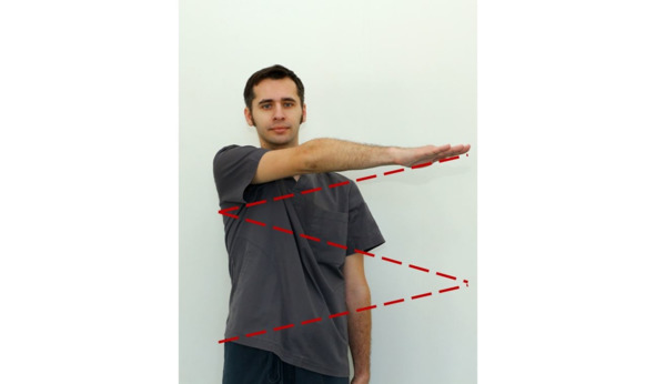 – В исходном положении стоя или сидя расположить правую руку на уровне лица со стороны (рис. 17). Выпрямленной правой рукой рисовать зигзаг, проводя линии под углом. Повторить 8—10 раз для каждой руки;