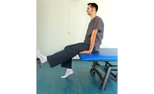 Рисунок 20. Упражнение лечебной физкультуры, используется стол для Войта-Бобат терапии: исходное положение – «сидя», нижние конечности согнуты в коленных и тазобедренных суставах, пальцы стоп с опорой на пол, поочередно выпрямляем левую и правую ногу, тянем стопу на себя, по 10 раз для каждой ноги.