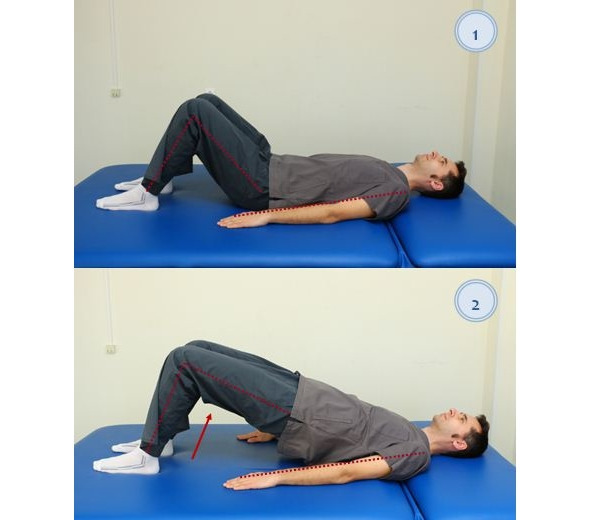 Рисунок 23. Упражнение лечебной физкультуры, используется стол для Войта-Бобат терапии: 1. Исходное положение «лежа на спине», руки вдоль туловища, ноги согнуты в коленных суставах; 2. То же положение с поднятым тазом. Повторяем по 10—15 повторов.