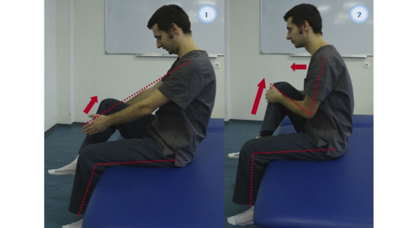 Рисунок 12. Упражнение лечебной физкультуры, используется стол для Войта-Бобат терапии: 1. Исходное положение «сидя», руки выпрямлены отведены за спину, ноги согнуты в коленных суставах, стопы слегка развернуты кнаружи; 2. То же положение, но руки согнуты в локтях, задерживаем положение на 10 сек; 3. Руки выпрямлены вперед, ноги согнуты в коленных суставах, стопы слегка развернуты кнаружи. Тянемся корпусом вперед, оставляя спину прямой, задерживаем положение на 5—10 сек., возвращаясь в исходное. Выполняем 8—10 повторов.