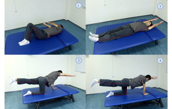 Рис. 22. Упражнение лечебной физкультуры, используется стол для Войта-Бобат терапии: 1. Исходное положение «лежа на животе», голова повернута влево, руки вдоль туловища, левая нога согнута в коленном суставе; 2. Положение «лежа на животе», голова повернута вправо, руки вдоль туловища, правая нога согнута в коленном суставе; 3. Положение «лежа на спине», плечи подняты вверх, руки согнуты в локтях, кисти и ладони развернуты вниз; 4. Положение «лежа на спине», плечи подняты вверх, руки согнуты в локтях, кисти и ладони развернуты вверх. Повторяем весь комплекс 5—10 раз.
